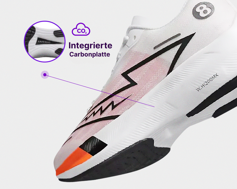Die in den Carbon-Sneaker integrierte Carbonplatte bietet die perfekte Balance zwischen Stabilität und Vortrieb. Ideal für mittlere und lange Distanzen – sie reduziert die Anstrengung und steigert deine Leistung bei jedem Schritt. Erlebe Laufen wie nie zuvor.